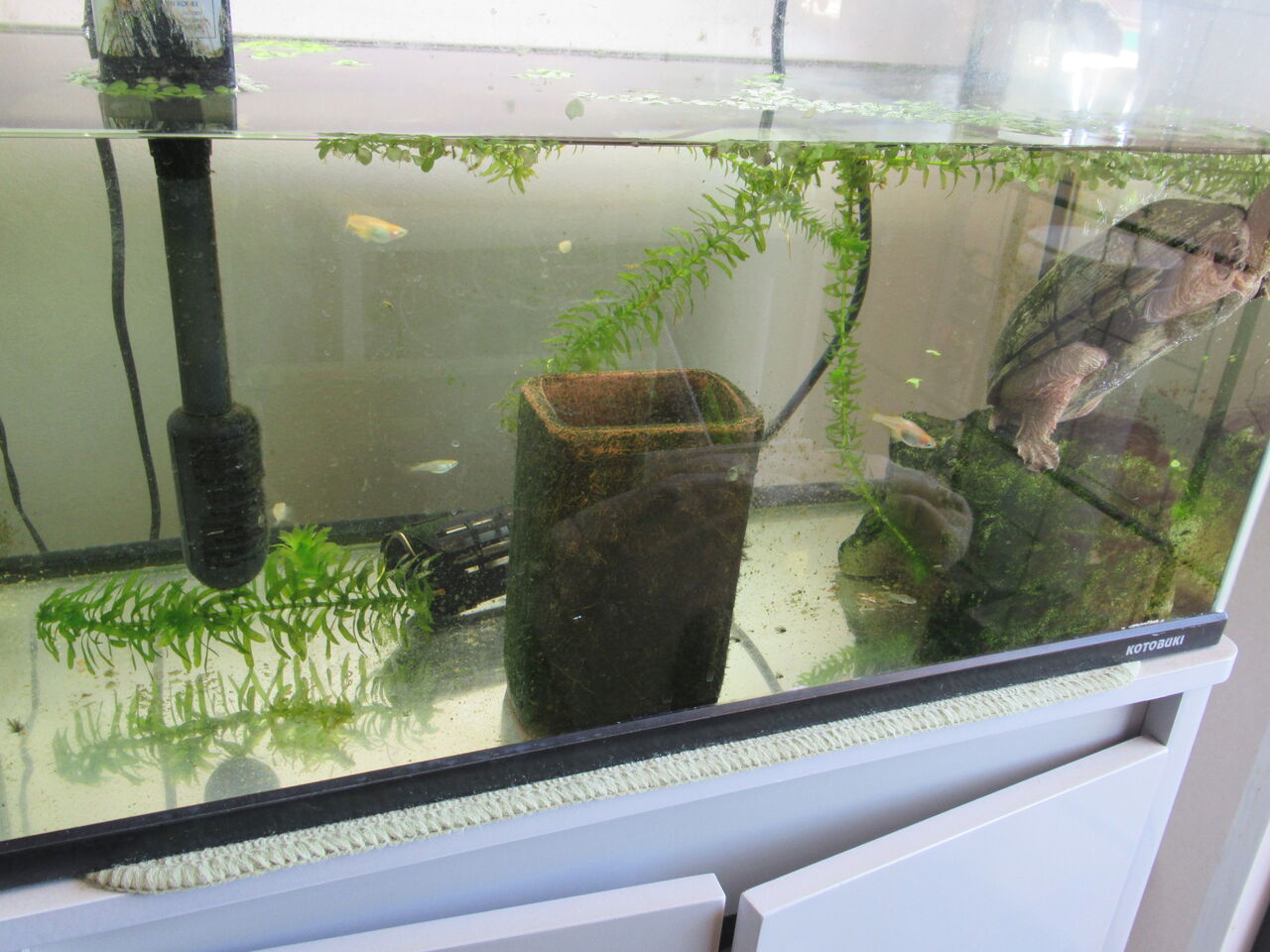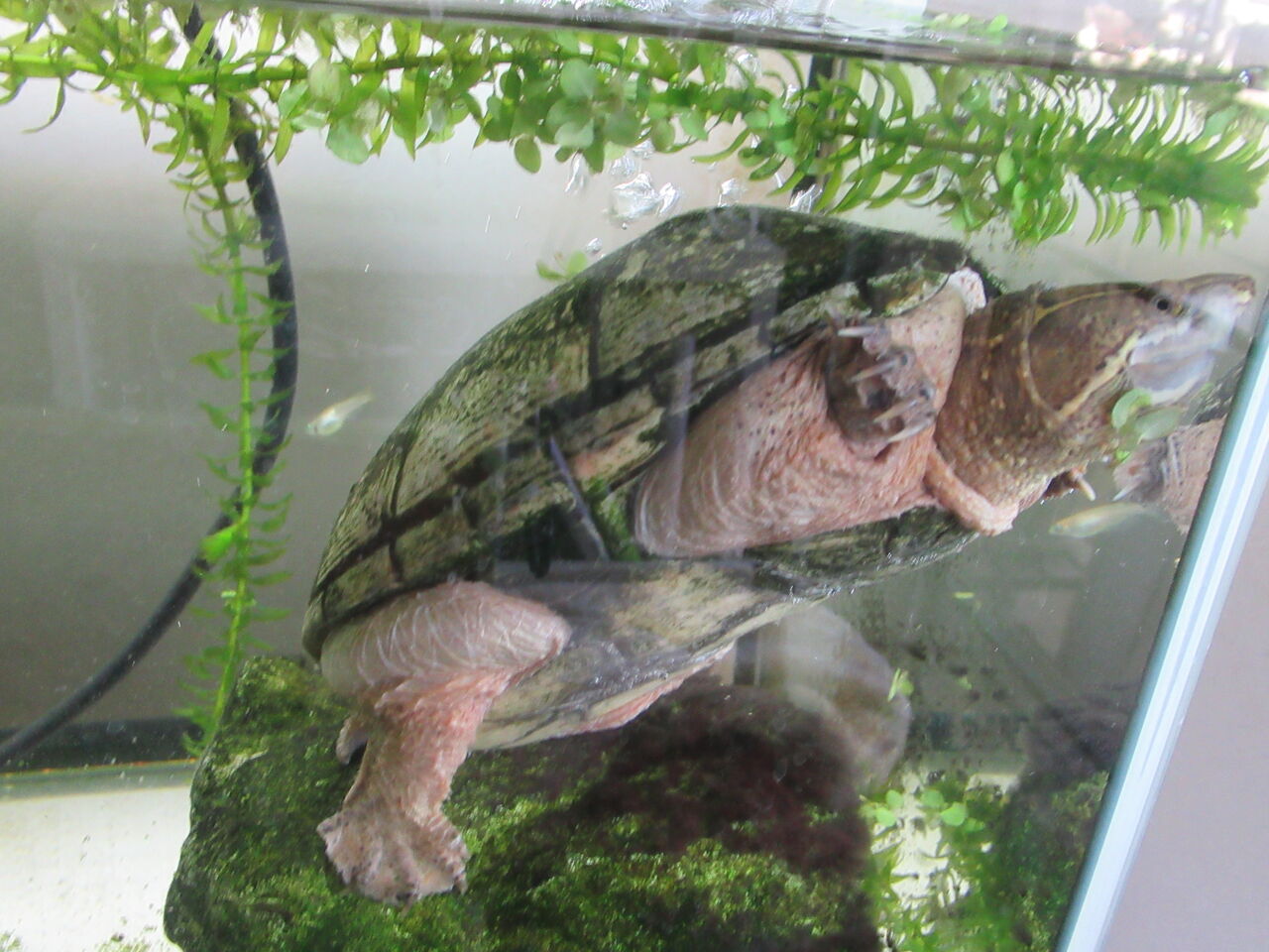 ミシシッピニオイガメの『ミッピーちゃん』ですが、冬の間は屋内の水槽で暮らしてもらっています。夏になれば、屋外のプールで暮らしてもらうのですが、夏どころか春はもう少しといったところですので、ヒーターで温かい水の中です。