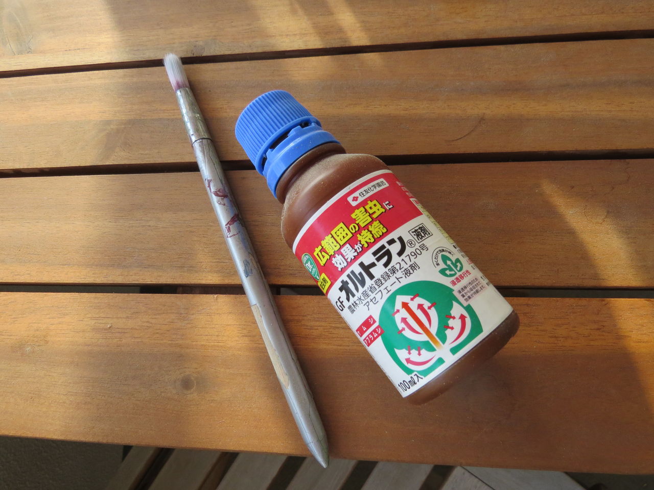 駆除剤『オルトラン』と絵具の筆を用意する。