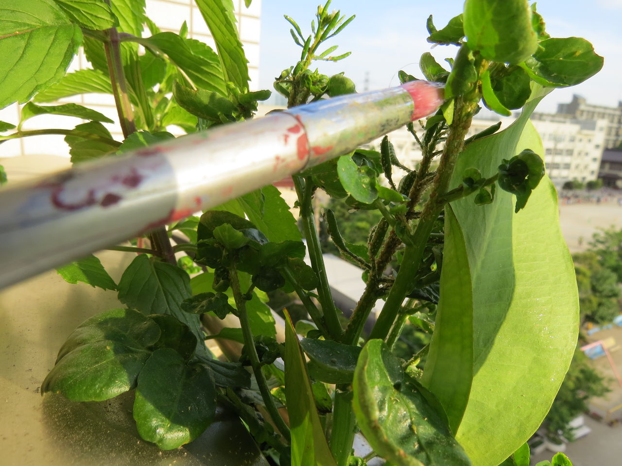 まず駆除剤『オルトラン』と絵具の筆を用意する。駆除剤『オルトラン』を容器に入れて、水を入れて希釈してから筆につける。そして一つ一つの茎に丁寧に塗っていく。