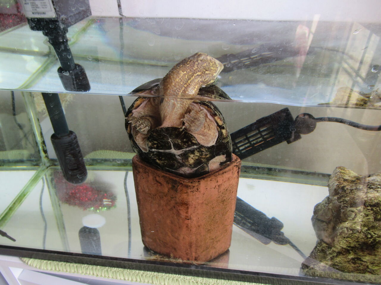 熱帯後水槽の掃除をして、ふと横のミシシッピニオイガメの『ミッピーちゃん』水槽を見ますと、『ミッピーちゃん』が動かずに、首がダランと伸びています。
