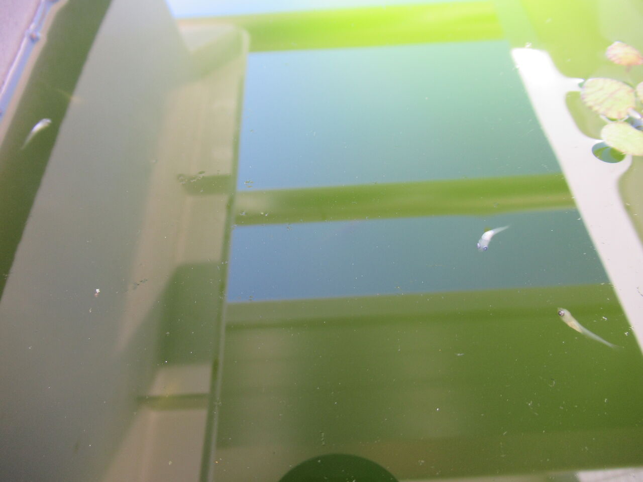 メダカの稚魚が生き残りやすい環境は、それはグリーンウォーターの環境です。グリーンウォーターは植物プランクトンが大量に発生した水ですので、人間には見えなくてもメダカの稚魚にはいつでも食べられる自然のエサなのです。