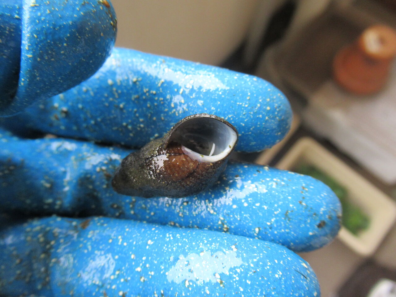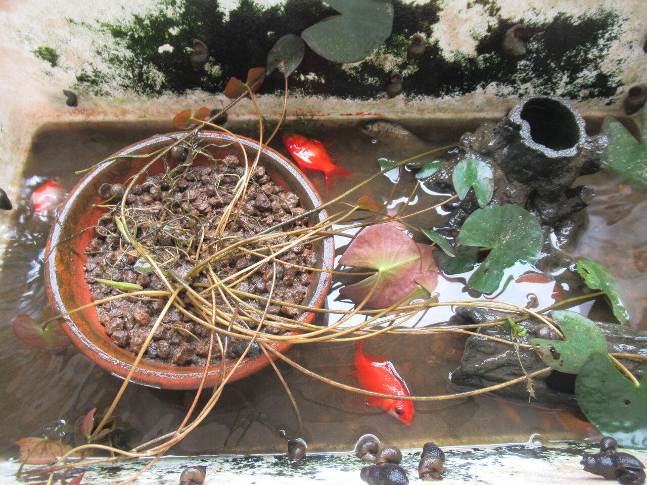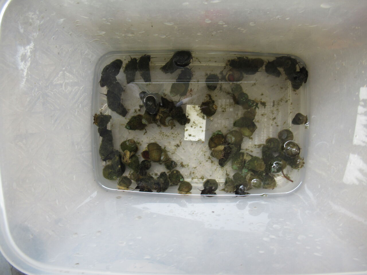 こちらはカワニナとタニシです。水質が悪いのでかなり個体数が減少しています。カワニナは別の容器に入れることにしました。