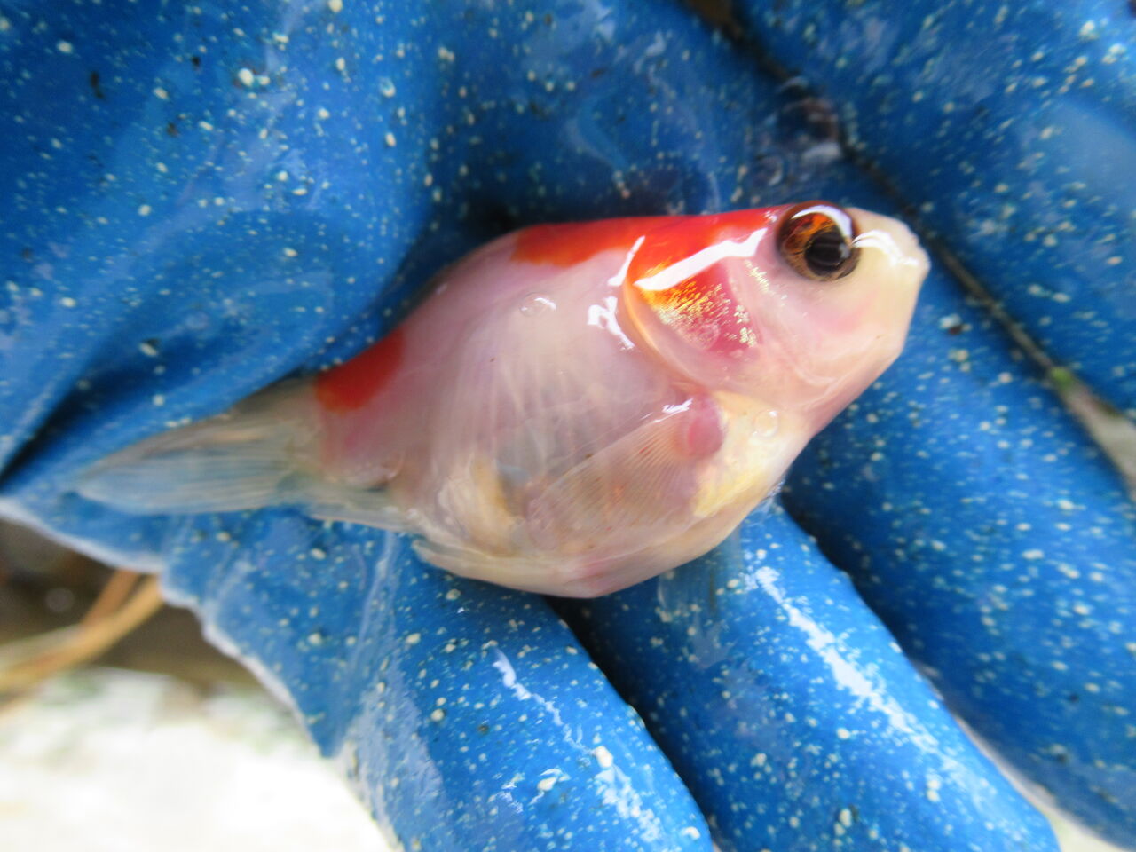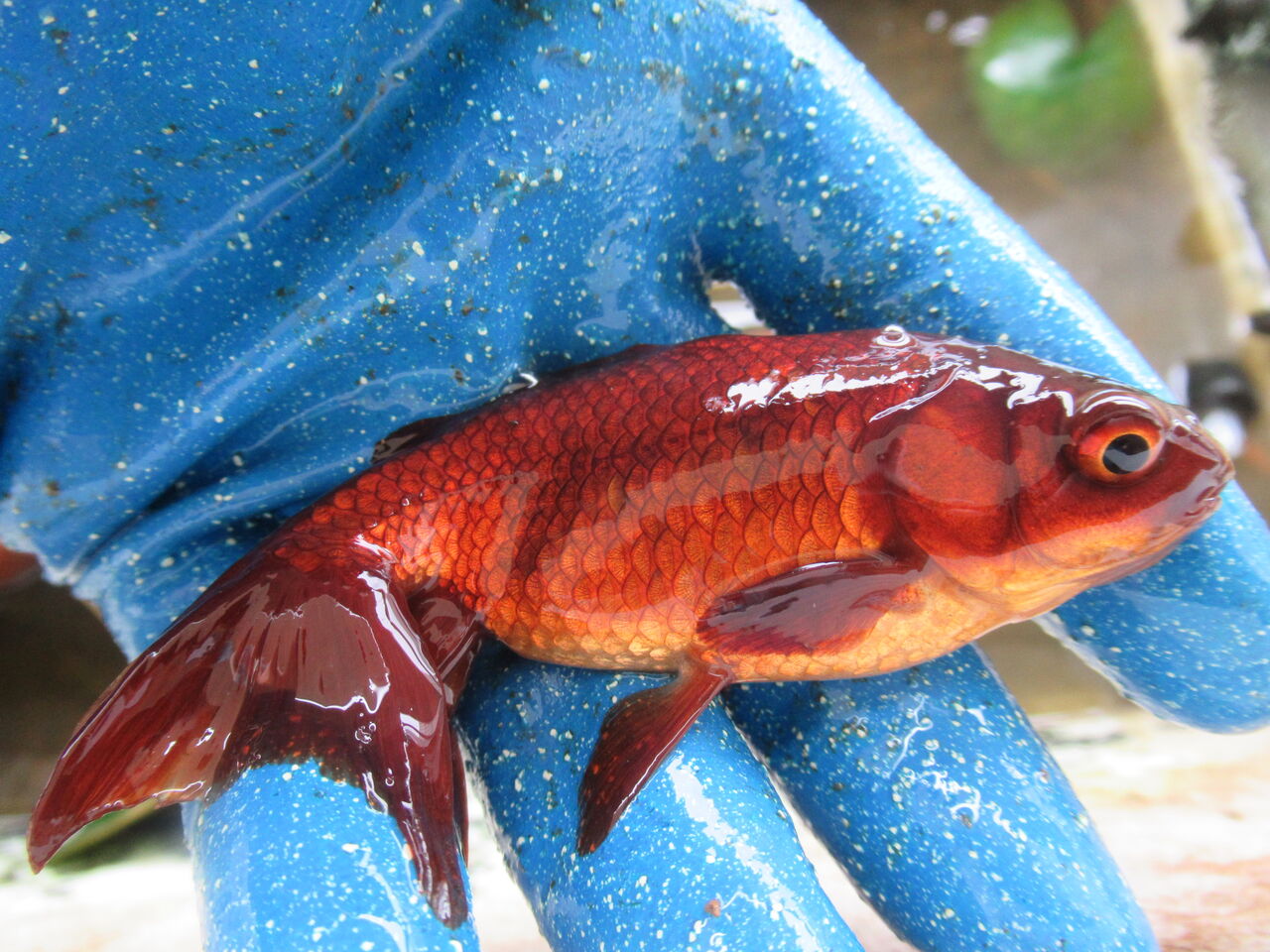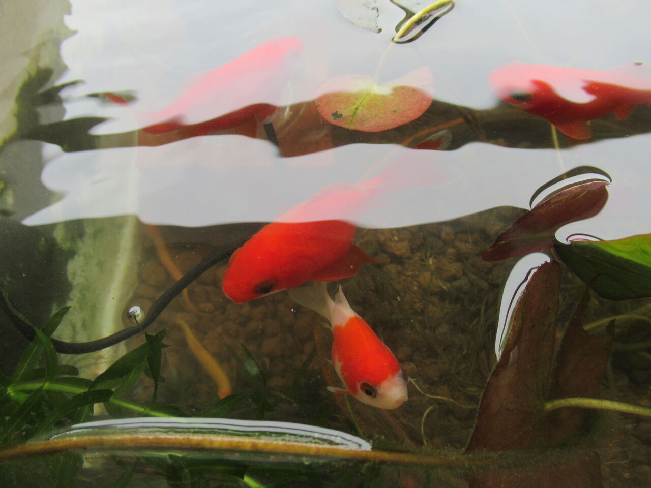更紗の福ダルマ金魚です。今シーズンからの新参者です。素赤のように大きくなってほしいです。