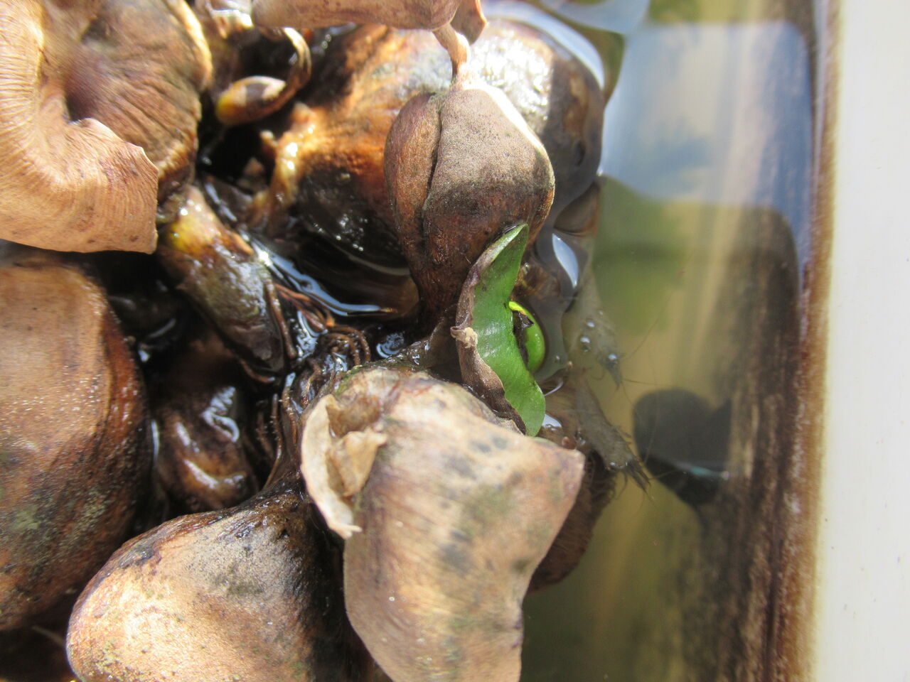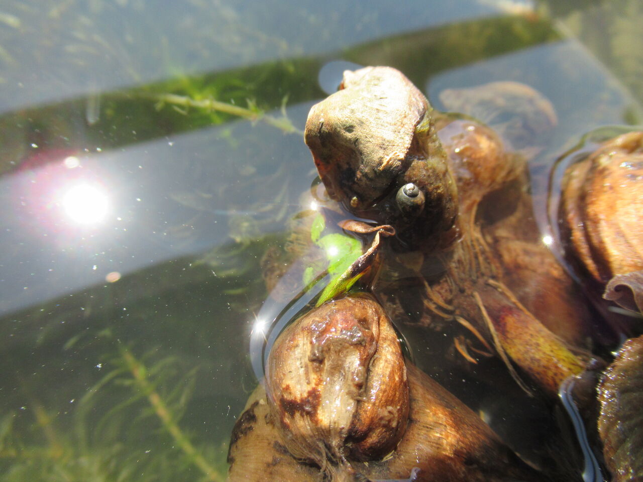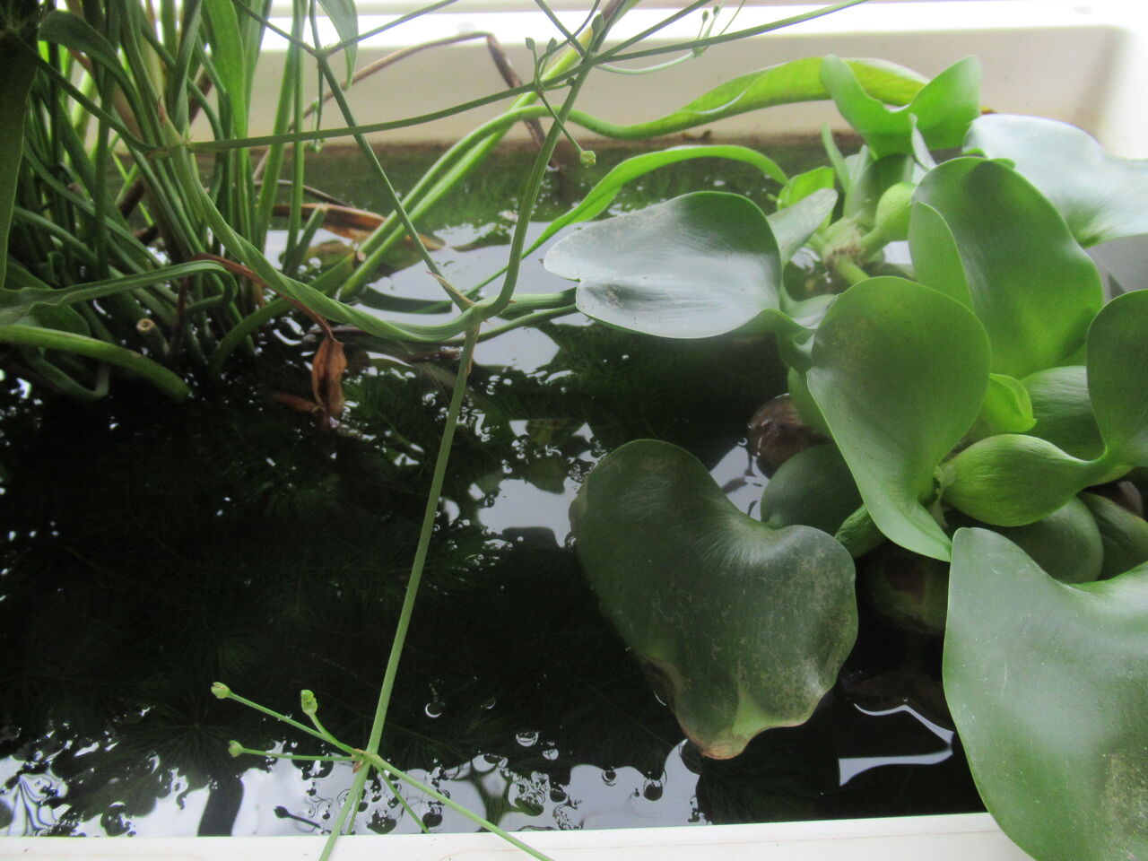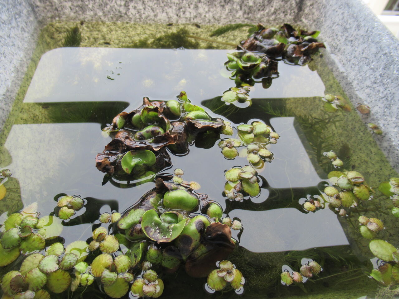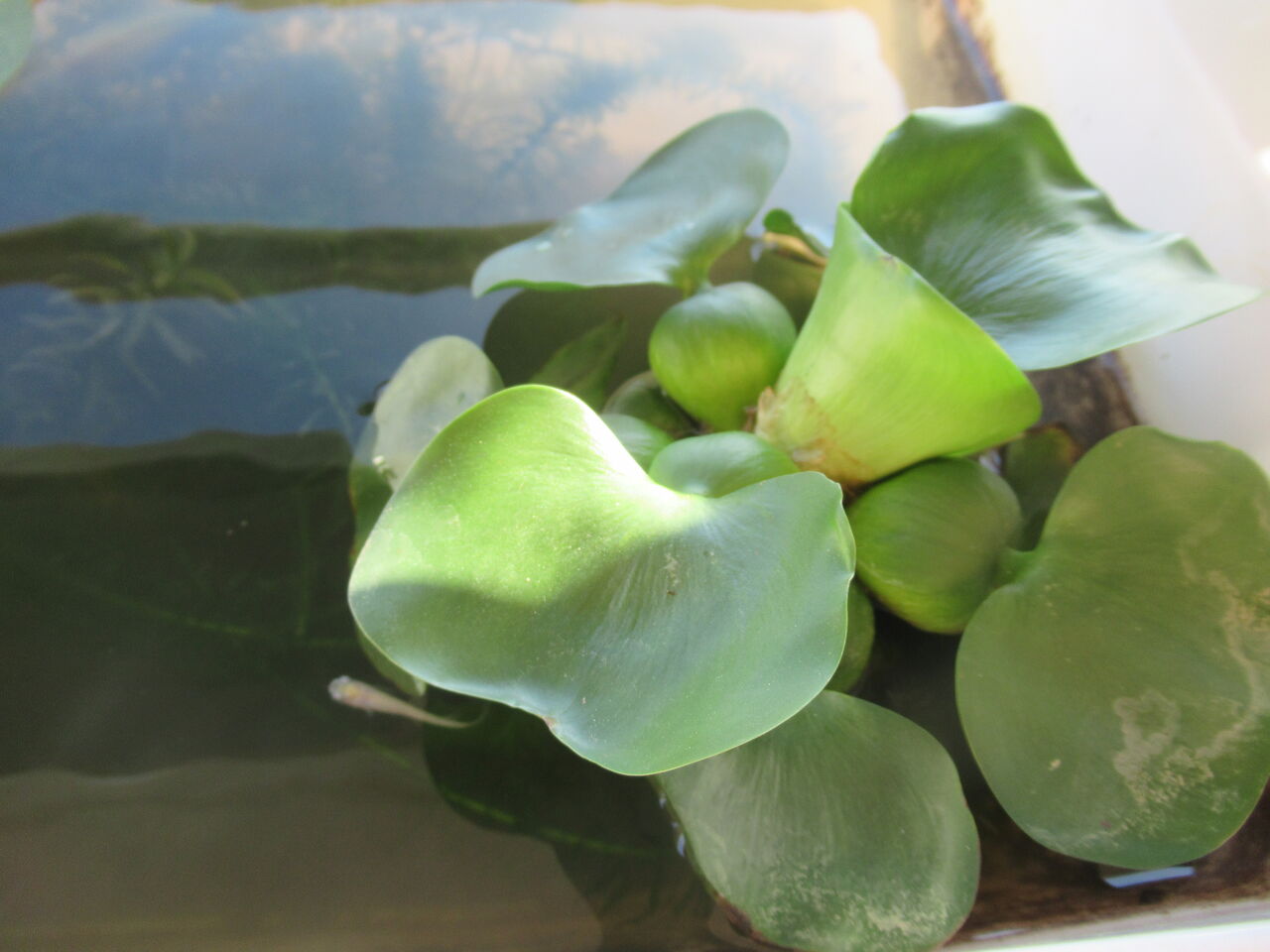 ホテイ草の根をカットしますと、浮草の役割を取り戻し、少しの風で水面を動いていくようになります。一定の箇所に留まっていないので、水底にも光があたり、バクテリアが元気に育ち、水を分解して浄化してくれます。ホテイ草自体の水質浄化能力は凄いのですが、根を切っても再び新しい根をすぐに生やしてきますので、根が水の養分を吸収してくれる能力が落ちるのは一時的なものです。