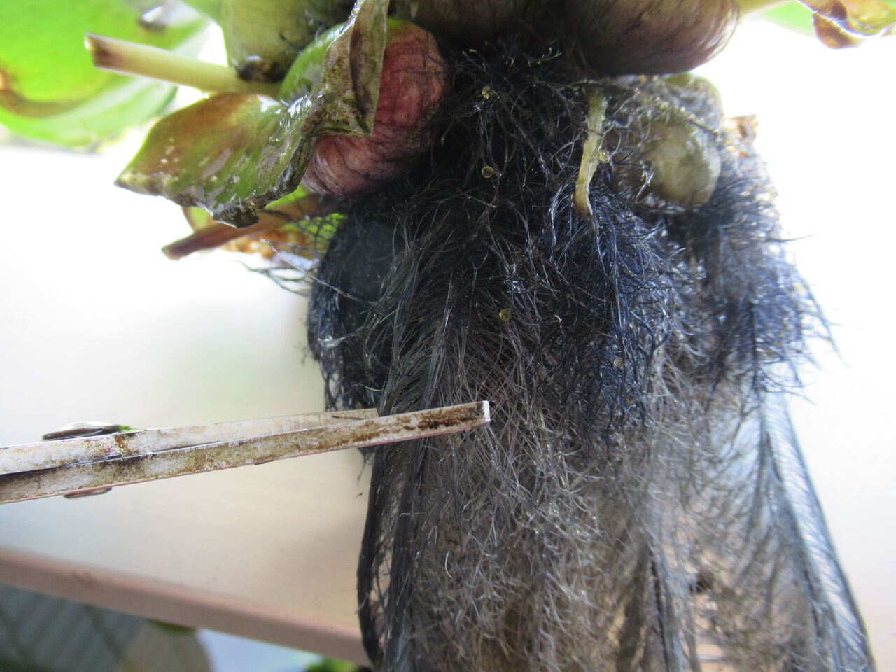 ホテイ草は大きくなるとともに、根を伸ばして水の中の栄養を吸収効率を上げてきます。そして、容器の底までは河川のように深くないので根付いてしまいますので、ここで根をカットして根付かないように、そして大きくならないようにします。