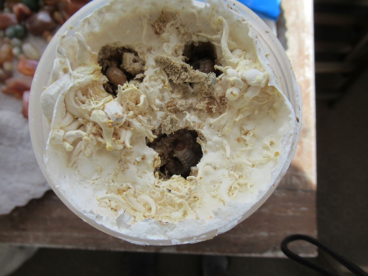 表面にあるキノコを取り除いて、菌糸を掘り続けますと幼虫がでてきました。結構大きくなっているかと思います。