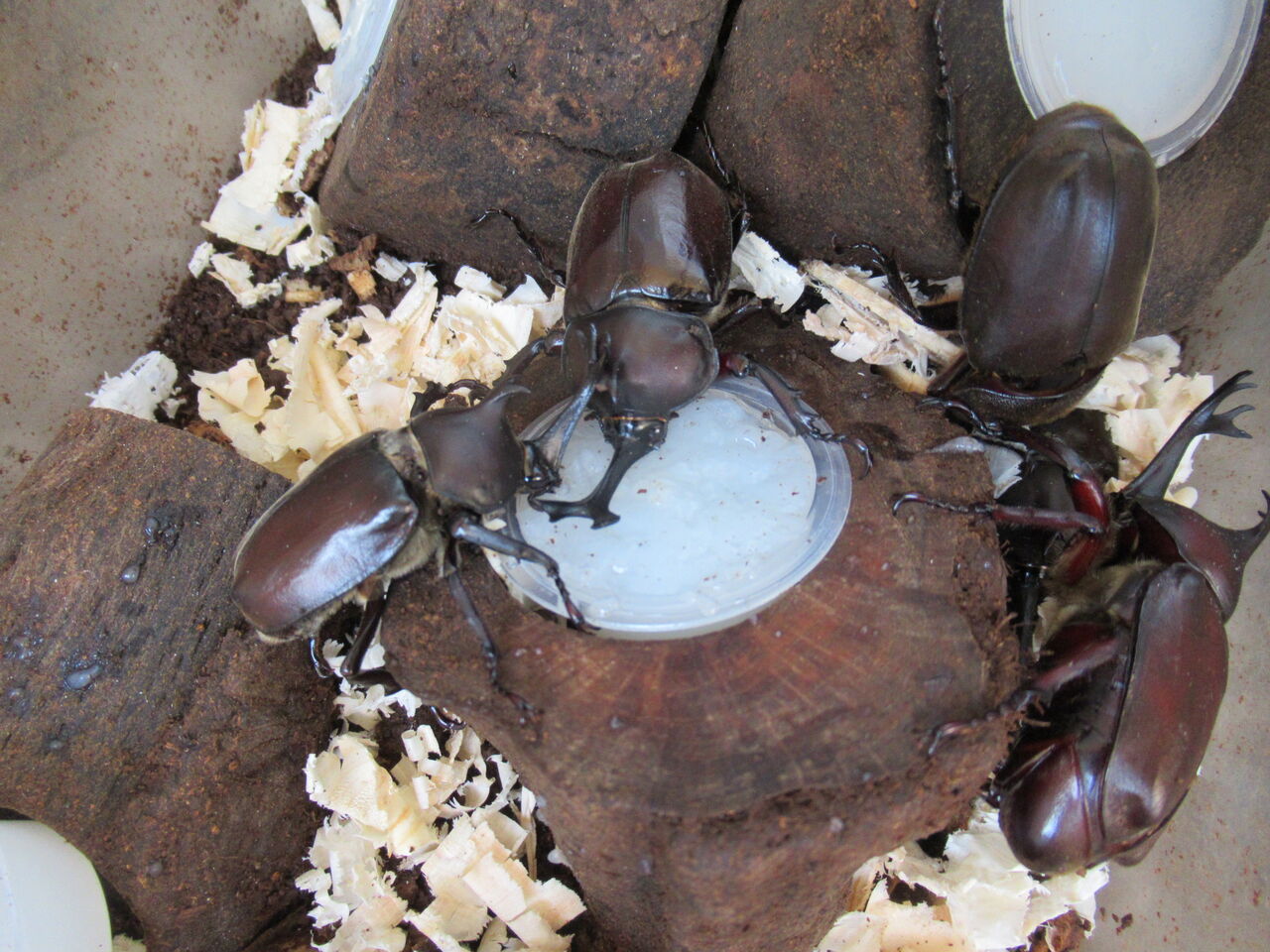 また、多頭飼育をしています。その年によりますが、大きな容量の菌糸ビンで成虫まで育てることがあれば、3令幼虫までは多頭飼育で、3令からは一頭飼育で行うときがあります。