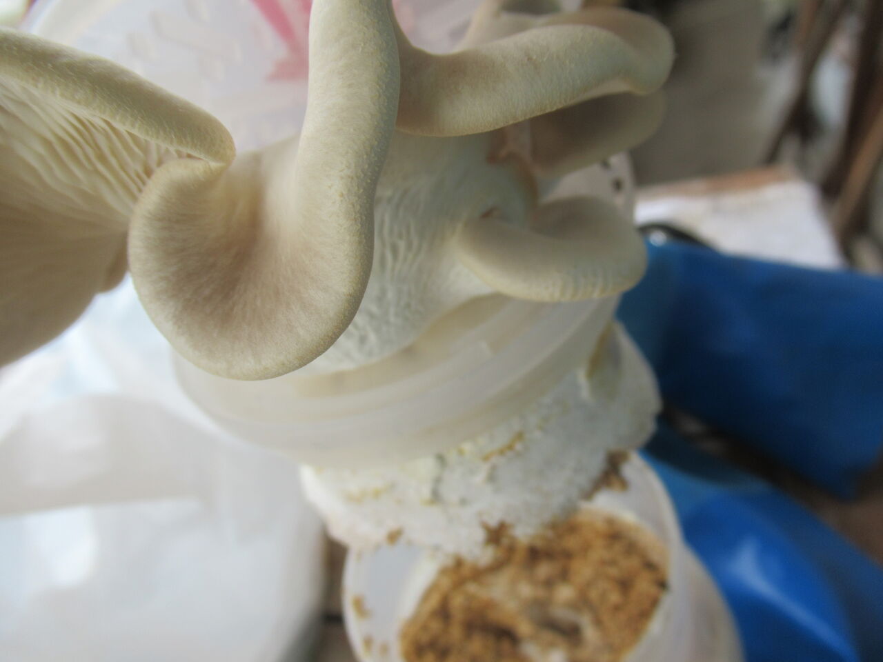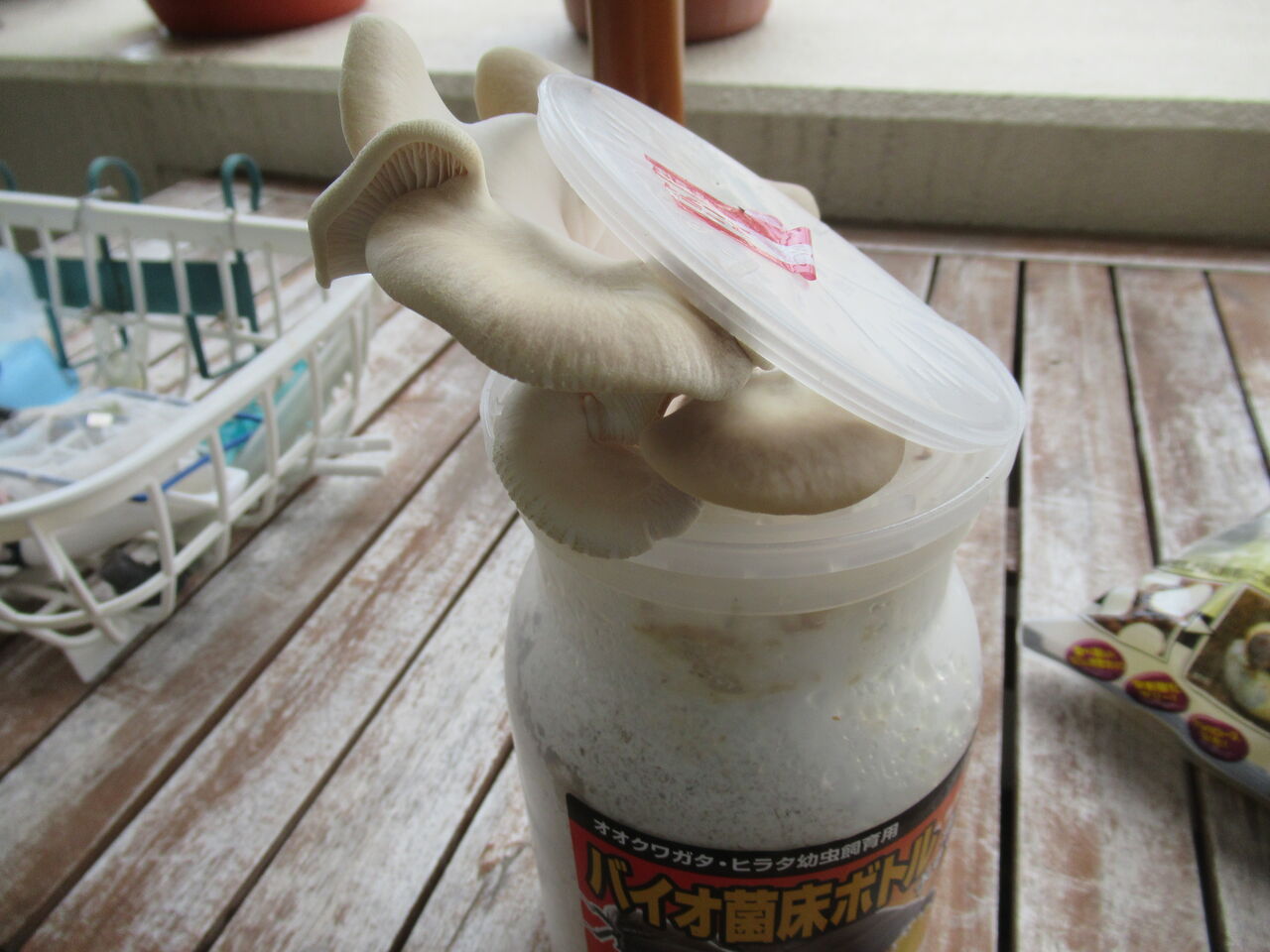 菌糸ビンを開けますとキノコが生えておりました。よくある光景ではあります。