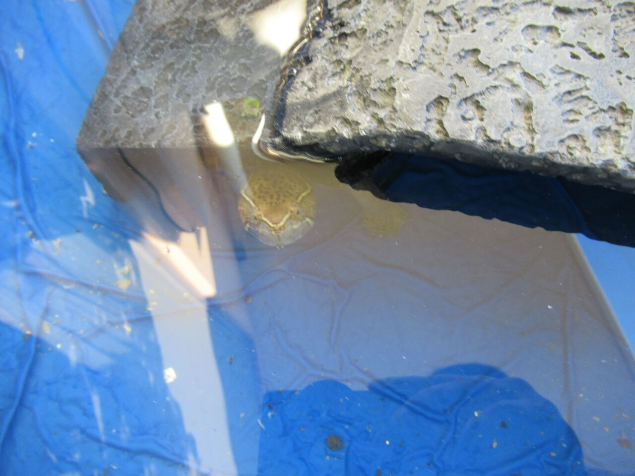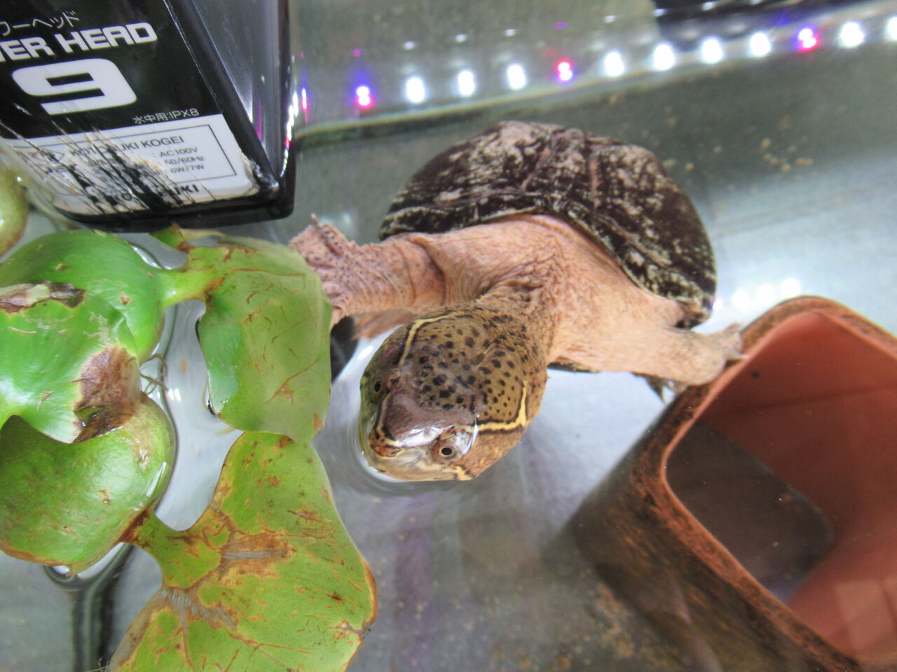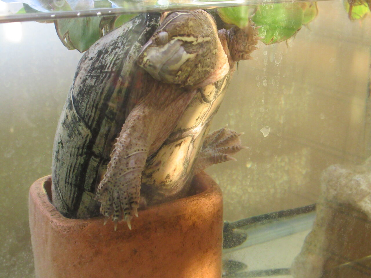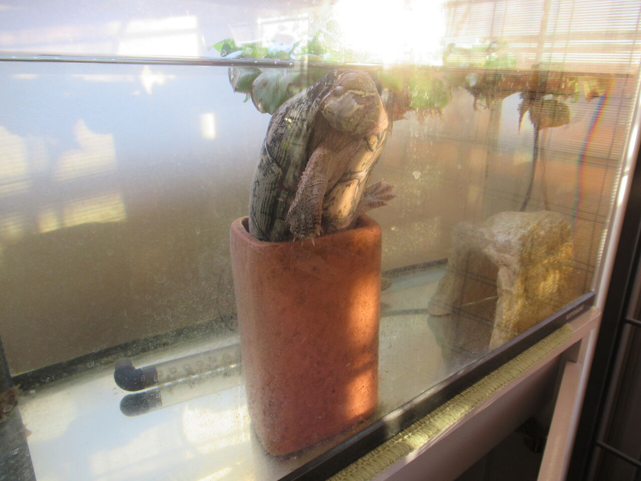 子供のころはくぐり抜けていたテラコッタトンネルですが、大きくなってくぐり抜けることができずに、縦に置いて息継ぎ用に置いていますが、そこがえらくお気に入りなのか、日中は、泳いで、水槽越しに屋外を見て(いるように感じます)、テラコッタトンネルで寝て、といったことを繰り返しております。