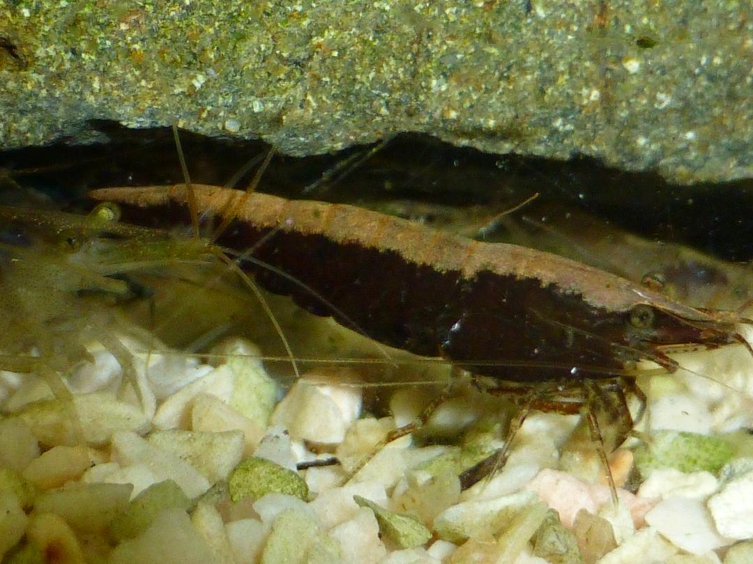 ミナミヌマエビの背中に白い帯が入るのはメスの老固体が多いと言われていますが、定かではありません。ただし、とても大きな個体がこのような体色に変化することが多いです。