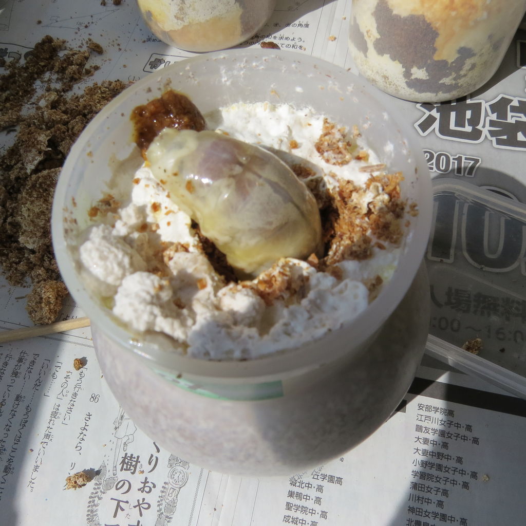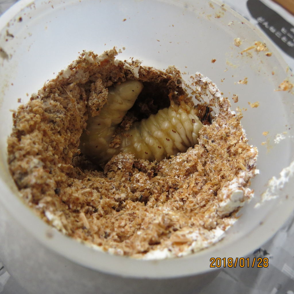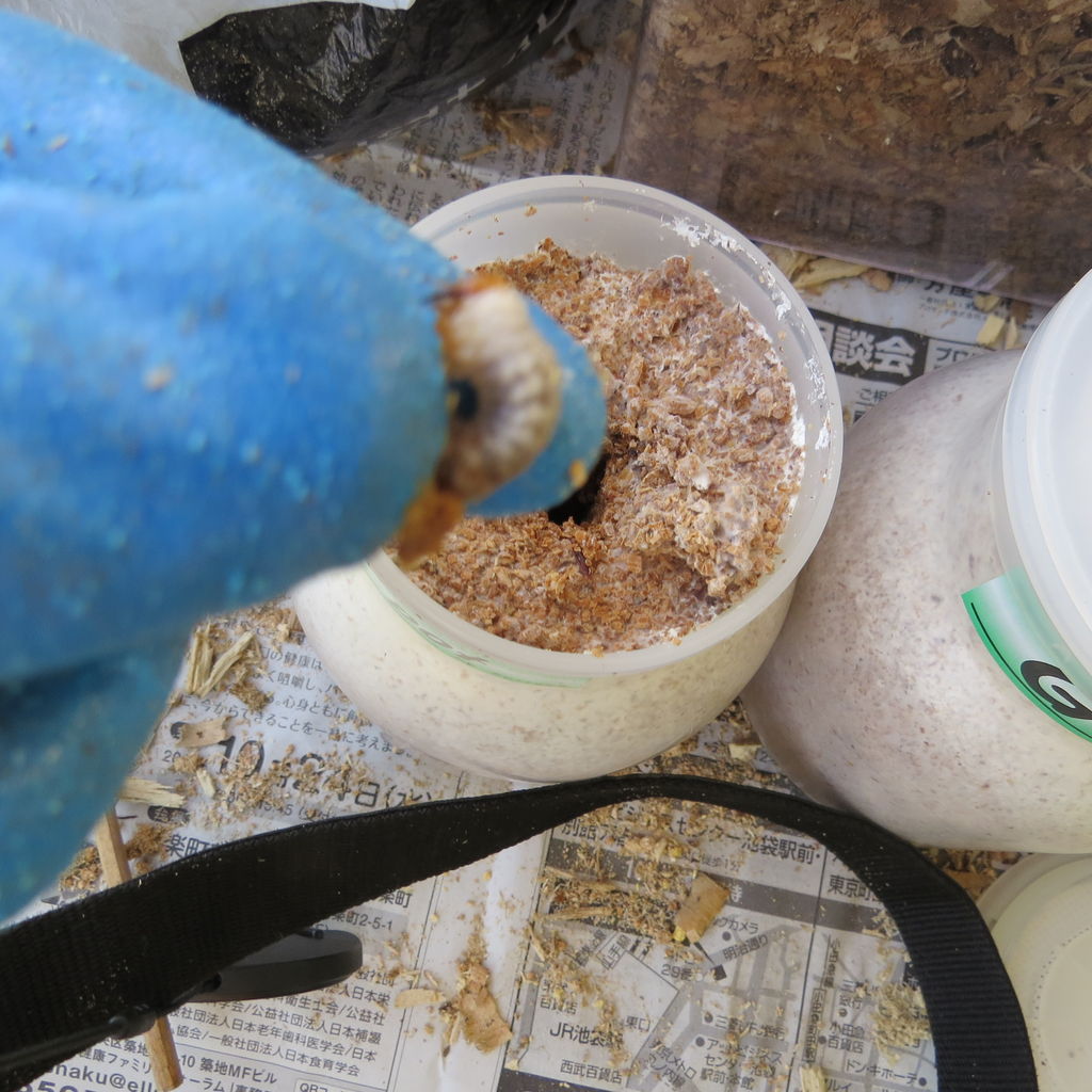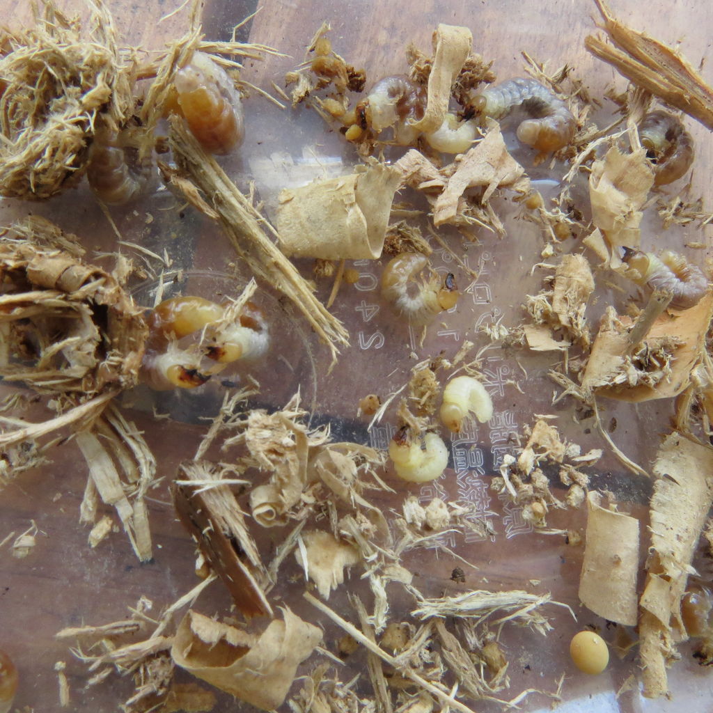 オオクワガタは産卵木を入れておけば、そのうちに産んでくれて、秋に割り出しをすると幼虫がでてきますが、これは何度でも嬉しくなってしまうものです。
