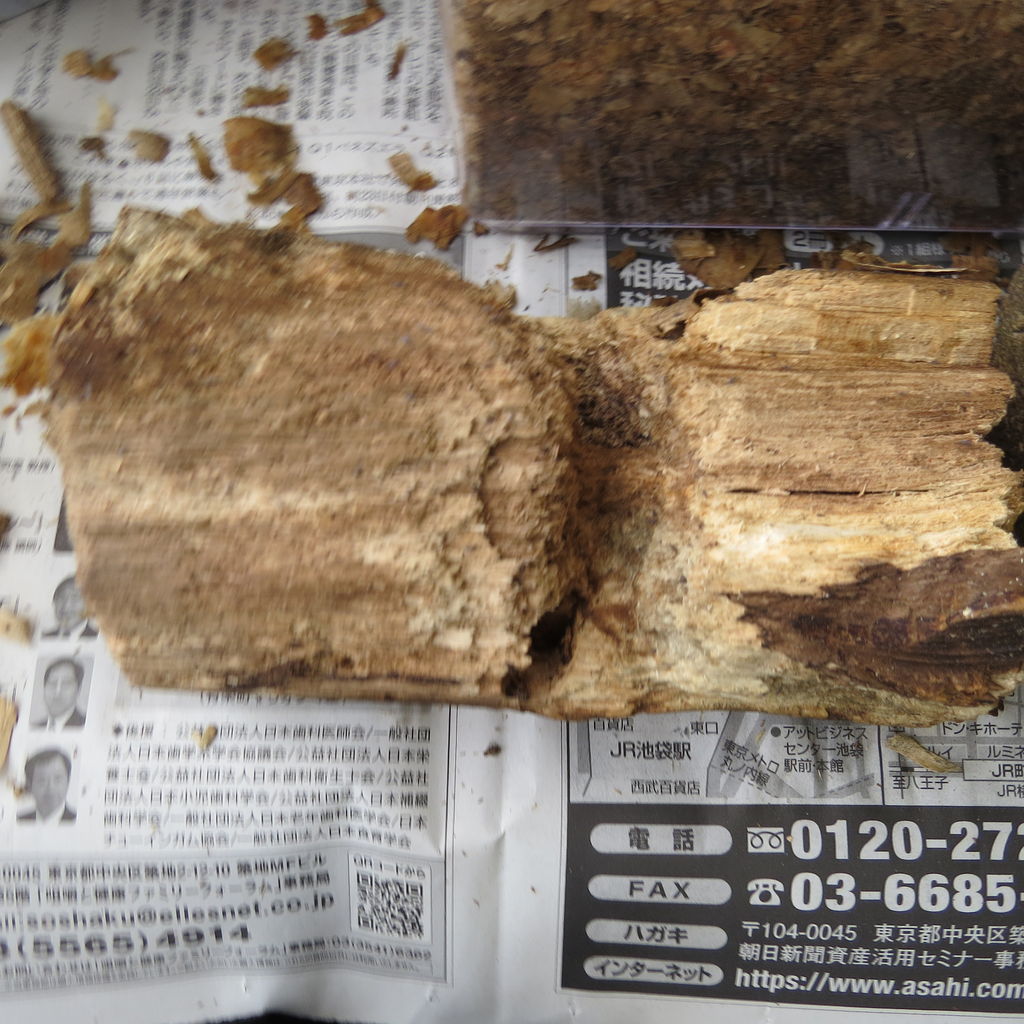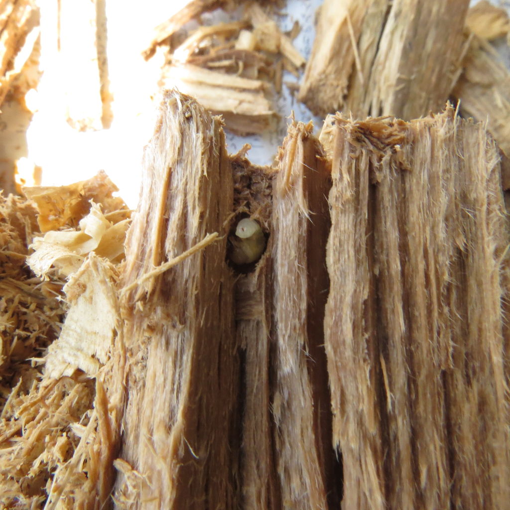 5.産卵木を割り出して幼虫を取り出す