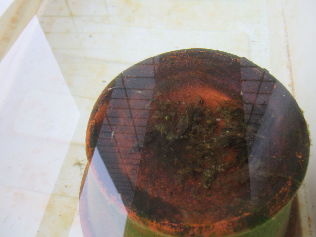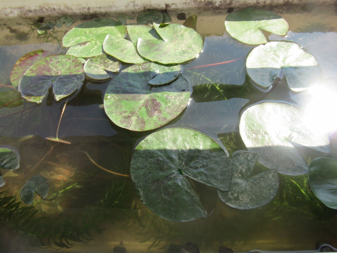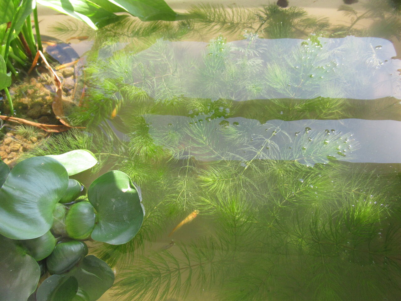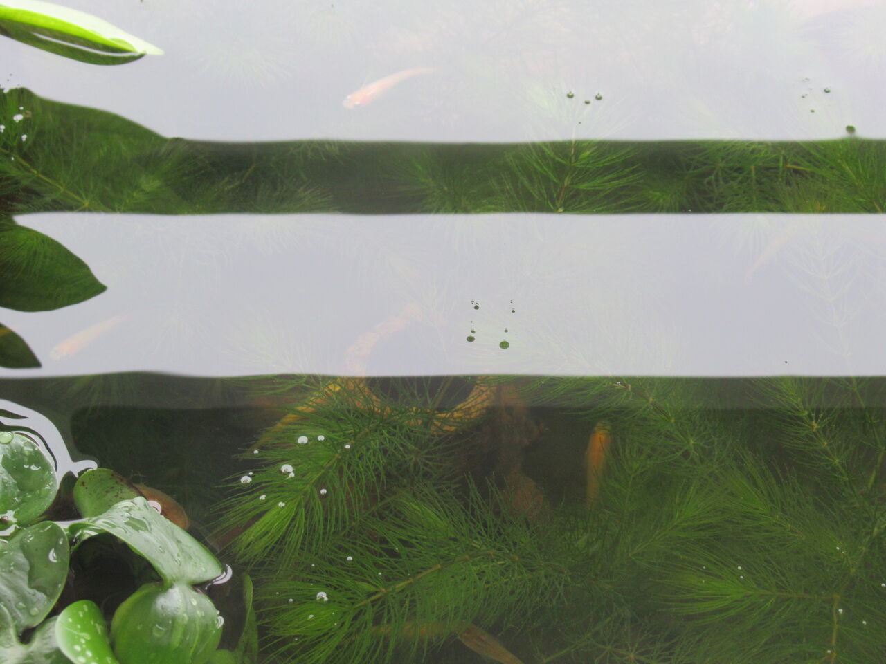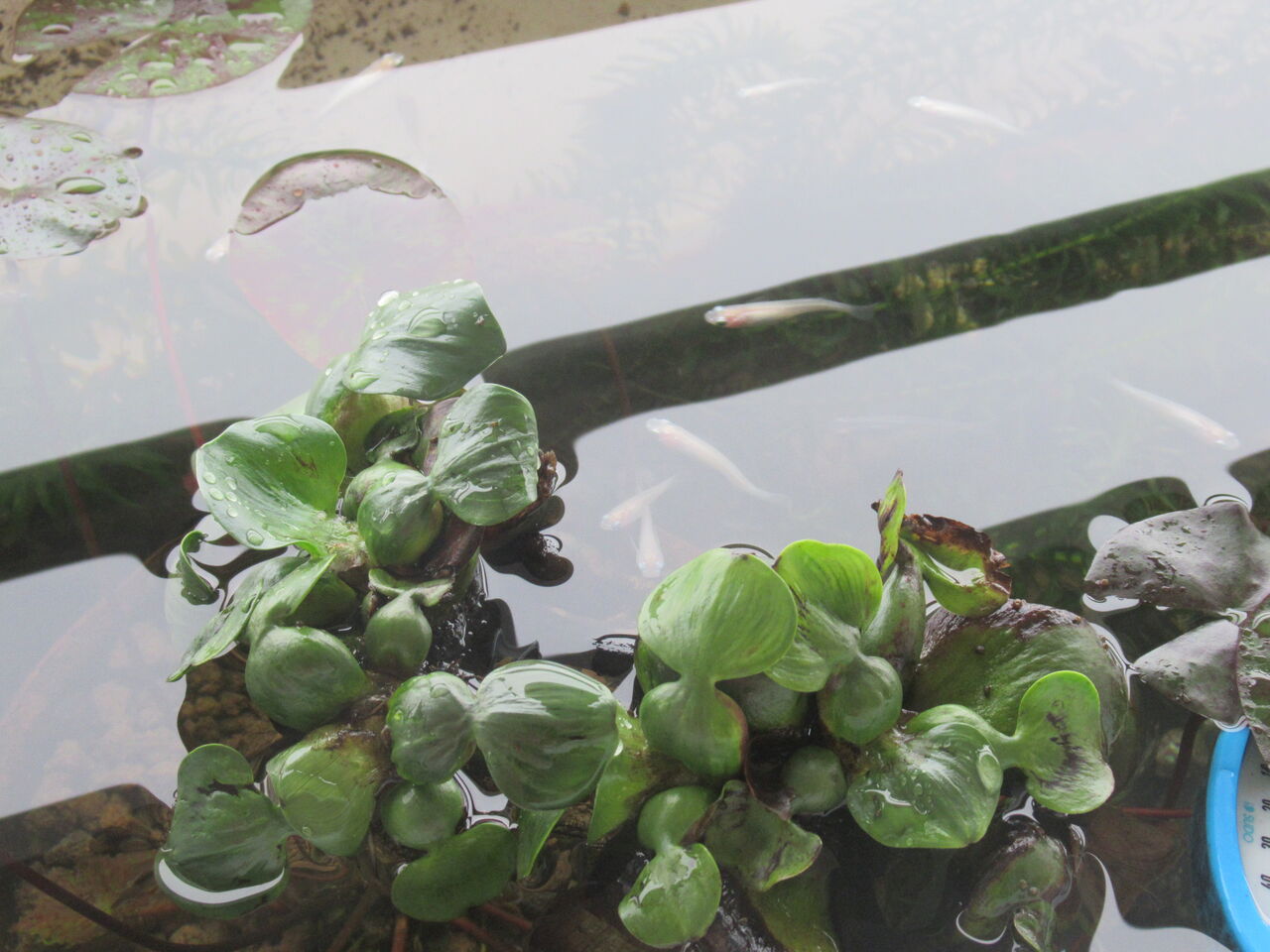 これに対応するのは、まずは水生植物を間引きして適度に少なくすることです。特に浮遊性植物(※2)を育てている場合は、水面を覆わないように、かなり多くの浮遊性植物を間引きすることです。浮遊性植物は猛暑日の日中は日陰になってくれて役に立つのですが、夜は水面を覆ってしまい、水面で呼吸するメダカの邪魔になるのです。そして、夜間の水生植物の「呼吸」により水中の少ない酸素がとられるのを抑えることができます。
