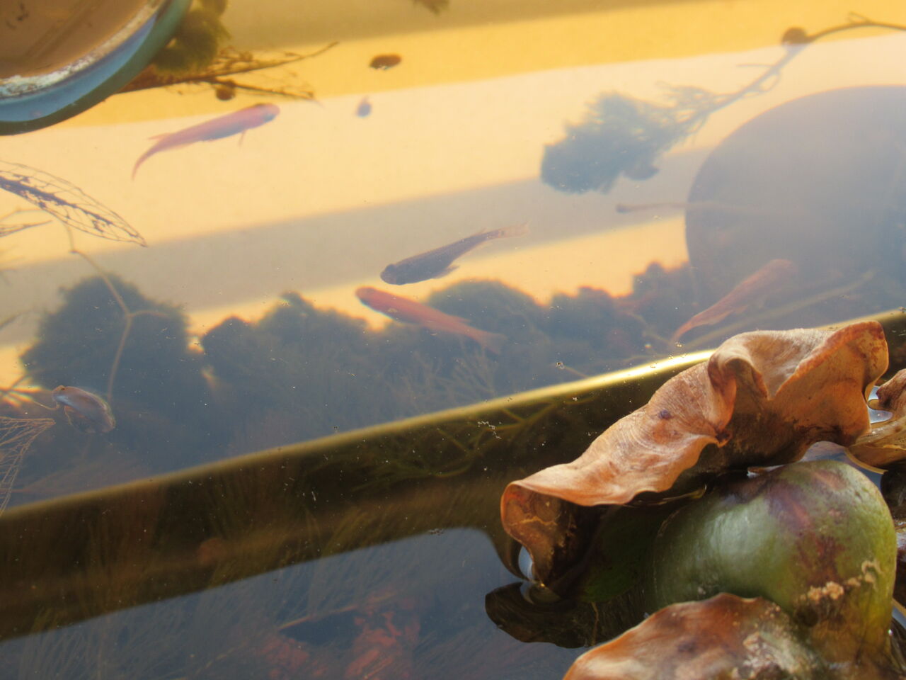 もちろん、繁茂している水草や岩、流木などのオーナメント、そして建物の陰、水温上昇対策で簾などの日蔭があるので、メダカたちは日中は日陰に隠れて静かに過ごしています。時には太陽を浴びて元気に泳ぎます。